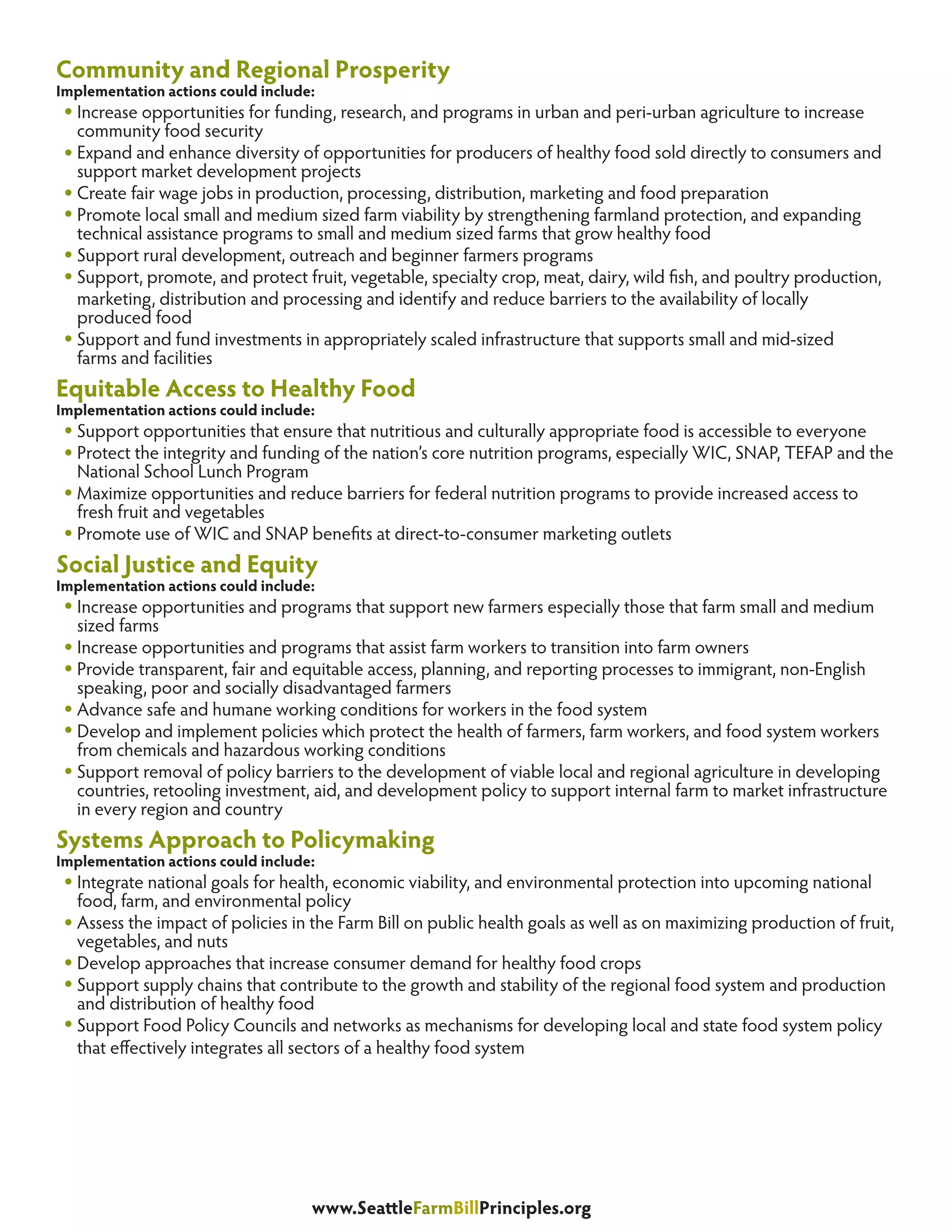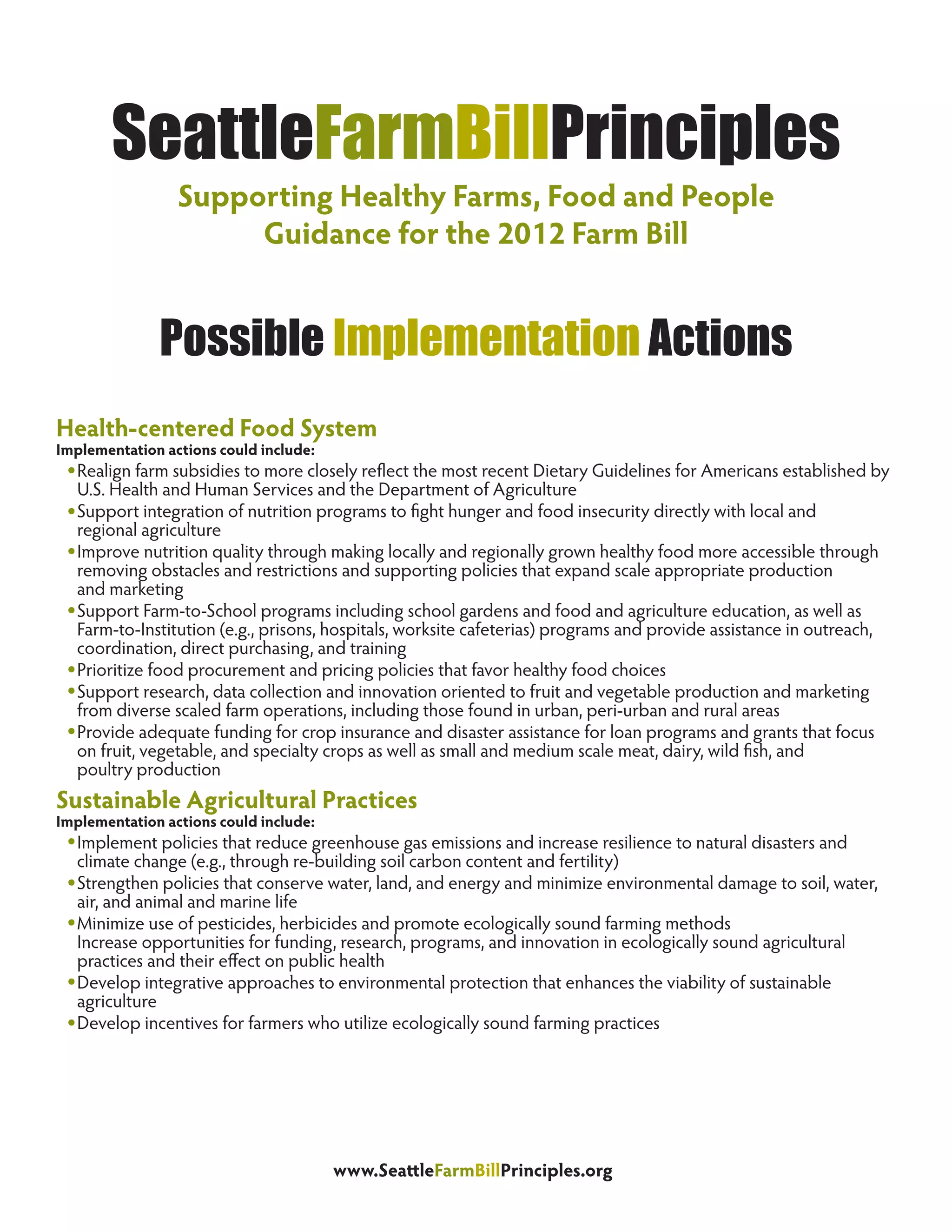 This document outlines principles for guiding the 2012 Farm Bill to support a healthy, sustainable, and equitable food system. It provides examples of implementation actions in several areas: 1) Realigning subsidies and programs to promote healthy food and nutrition; 2) Supporting sustainable agricultural practices to reduce environmental impact; 3) Increasing regional prosperity through urban agriculture, support for small farms, and job creation; 4) Ensuring equitable access to healthy food for all; and 5) Taking a systems approach to policymaking to integrate goals around health, environment, and local economies.