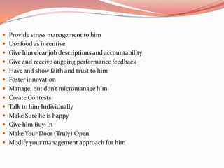 The document provides various suggestions for motivating an employee, including providing training and personal development opportunities, recognizing individual and group accomplishments, rewarding hard work, promoting communication and innovation, offering leadership roles and growth opportunities, and establishing fair policies and compensation.