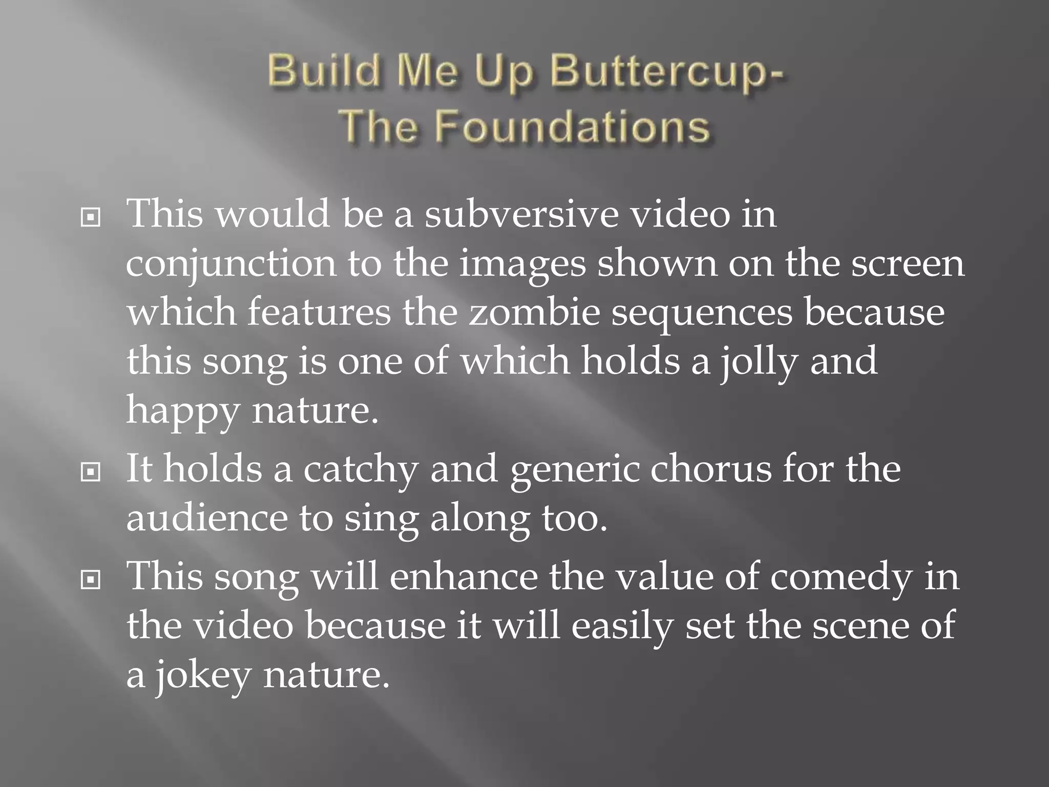 This document discusses using the song "Build Me Up Buttercup" by The Foundations in a comedy music video featuring zombies. It notes that the song has a catchy chorus and jolly nature that would enhance the humor in scenes showing zombies. Using this song would contrast with the existing music video and draw new attention. The fast pace of the song would also compliment a quickly paced zombie video. Including a surprise "Punk'd" style ending would create humor and contrast between the serious song and lighthearted video.