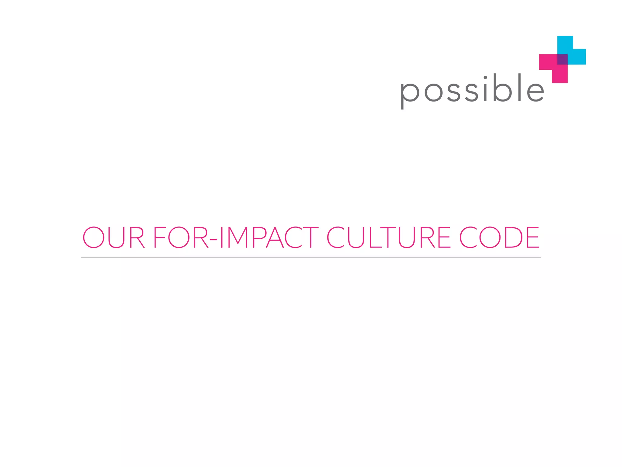 This document outlines the culture code of Possible, an organization aiming to deliver high-quality, low-cost healthcare to the world's poor. The 11 principles that drive Possible's "for-impact" culture are: 1) Put patients first, 2) Embrace challenges with grit, 3) Treat efficiency as a moral must, 4) Think big, 5) Build simple solutions, 6) Challenge conventional thinking, 7) Realize great design creates dignity, 8) Be transparent until it hurts, 9) Balance professional intensity with personal support, 10) Make commitments with integrity, and 11) Believe that everything is impossible until it isn't. The overarching goal of this culture is to get remarkable results for patients.