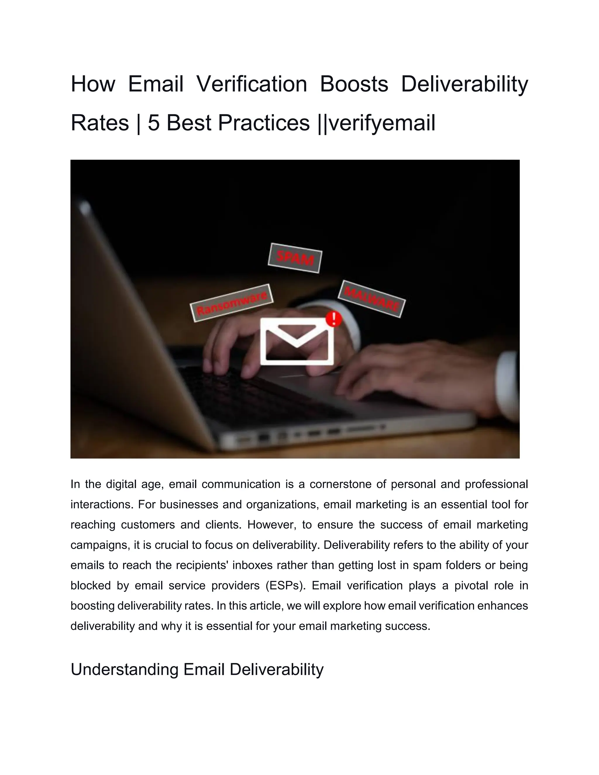 Email verification is crucial for improving email deliverability rates, which are affected by sender reputation, content quality, and list quality. Validating email addresses reduces bounce rates, protects against spam traps, and enhances engagement, ultimately maintaining a positive sender reputation. Best practices for email verification include regular list verification, using reputable services, and adhering to regulations.