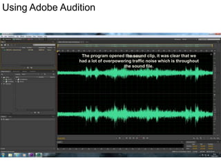 The document describes editing sound from a video shot in a tunnel. There was significant background traffic noise on the original recording. Using Adobe Audition, the editor captured the traffic noise profile and applied noise reduction to the entire sound clip. After testing, the changes were finalized, removing most of the traffic noise while keeping some background sound to maintain atmosphere. The result was a file with Charlie's voice clearly audible over reduced background noise.