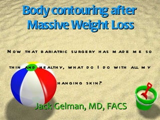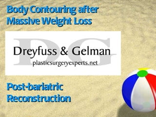 Body contouring procedures like tummy tucks, arm lifts, and thigh lifts are important after massive weight loss to remove excess skin. Re-contouring the trunk through procedures like abdominoplasty are especially key. An abdominoplasty involves tightening the rectus muscles and removing the pannus to improve the appearance of the abdomen. These procedures can make a big difference for those who have lost significant weight through bariatric surgery but are left with loose skin.