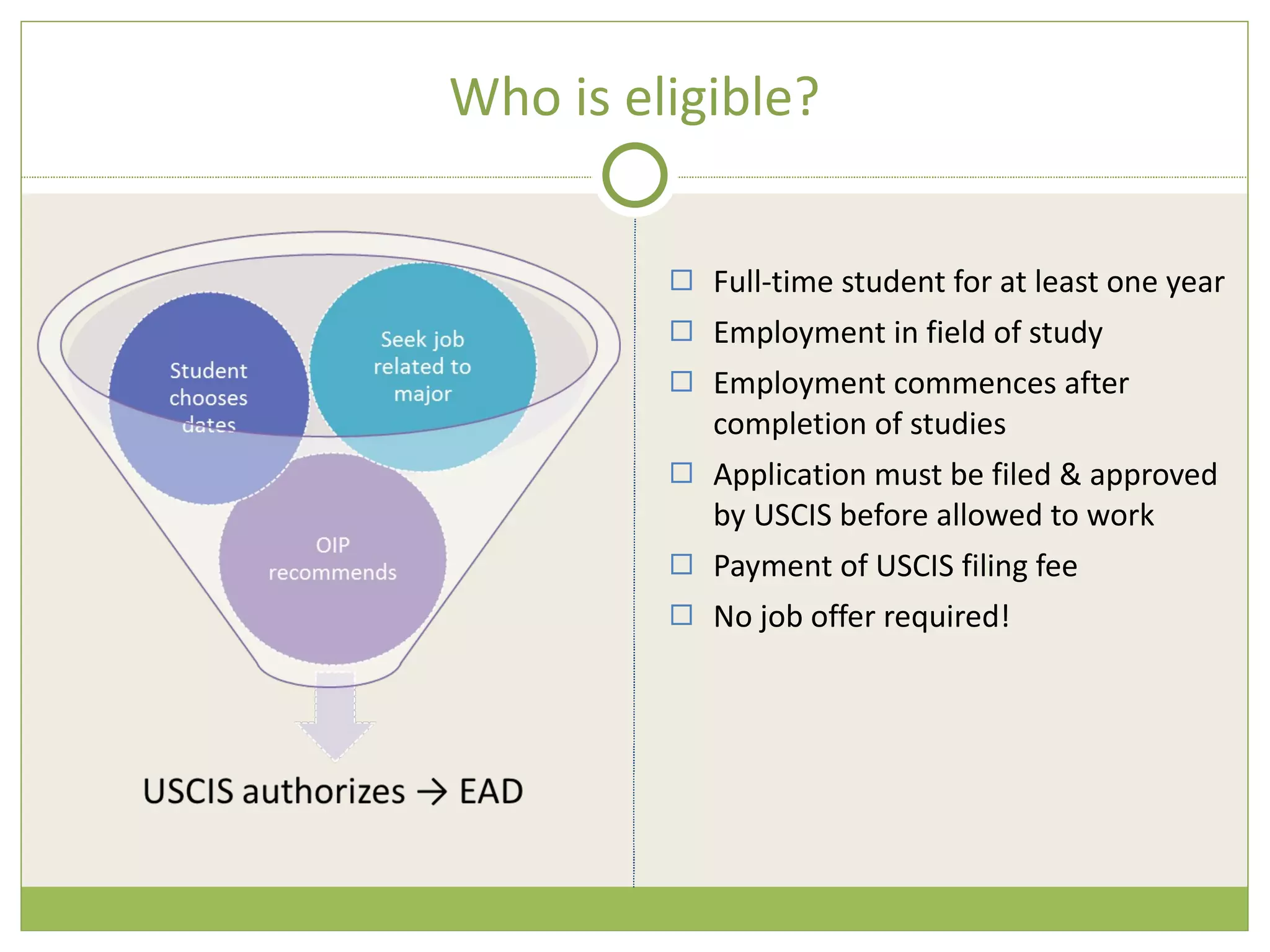 This document provides an overview of the post-completion optional practical training (OPT) process for F-1 visa students in the United States. It outlines eligibility requirements, timelines for application submission and OPT start dates, required application materials, USCIS processing times, and responsibilities during the OPT period such as employment requirements and travel limitations. The document also briefly discusses the 17-month STEM extension and H-1B cap-gap extension options available to some students.