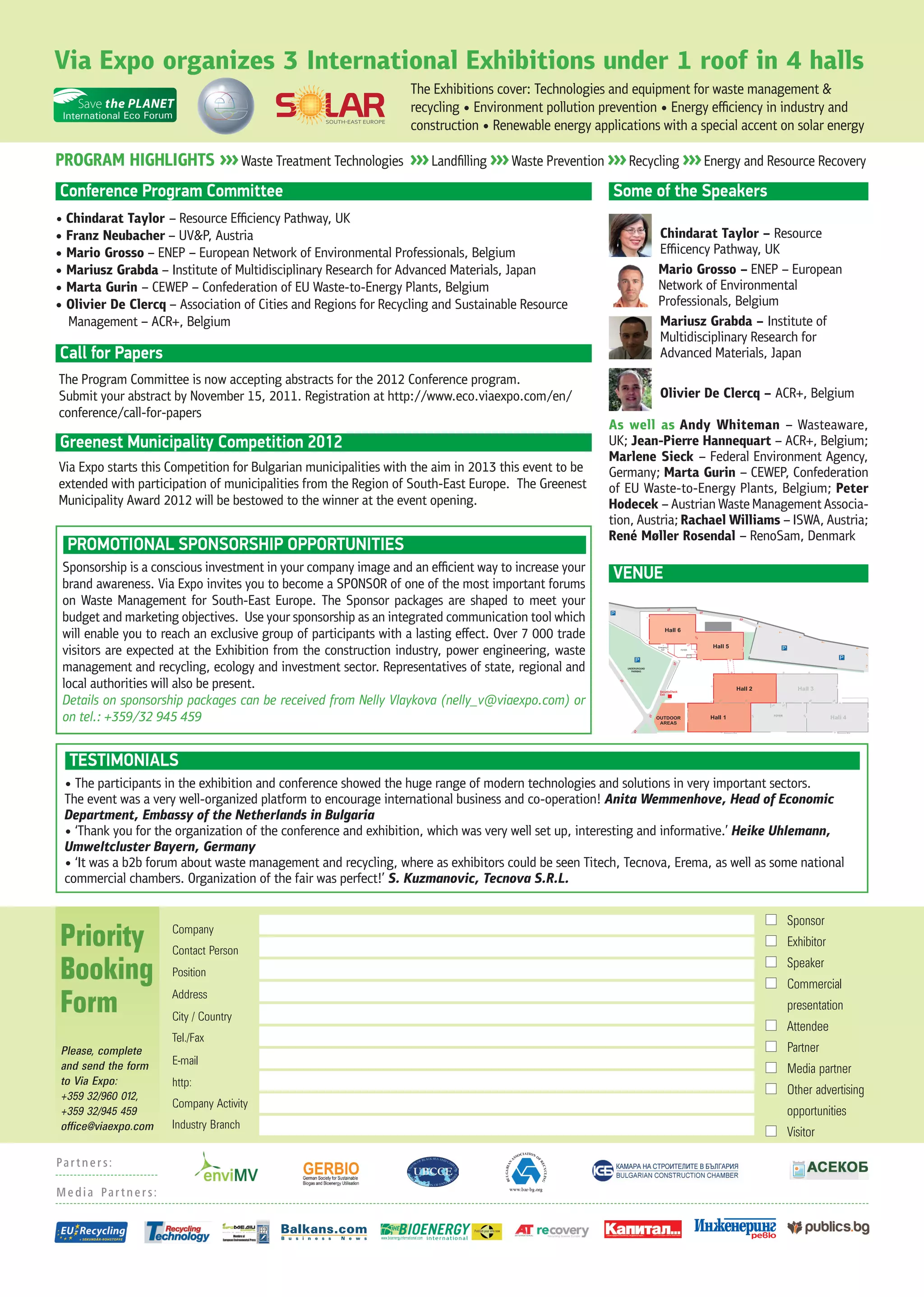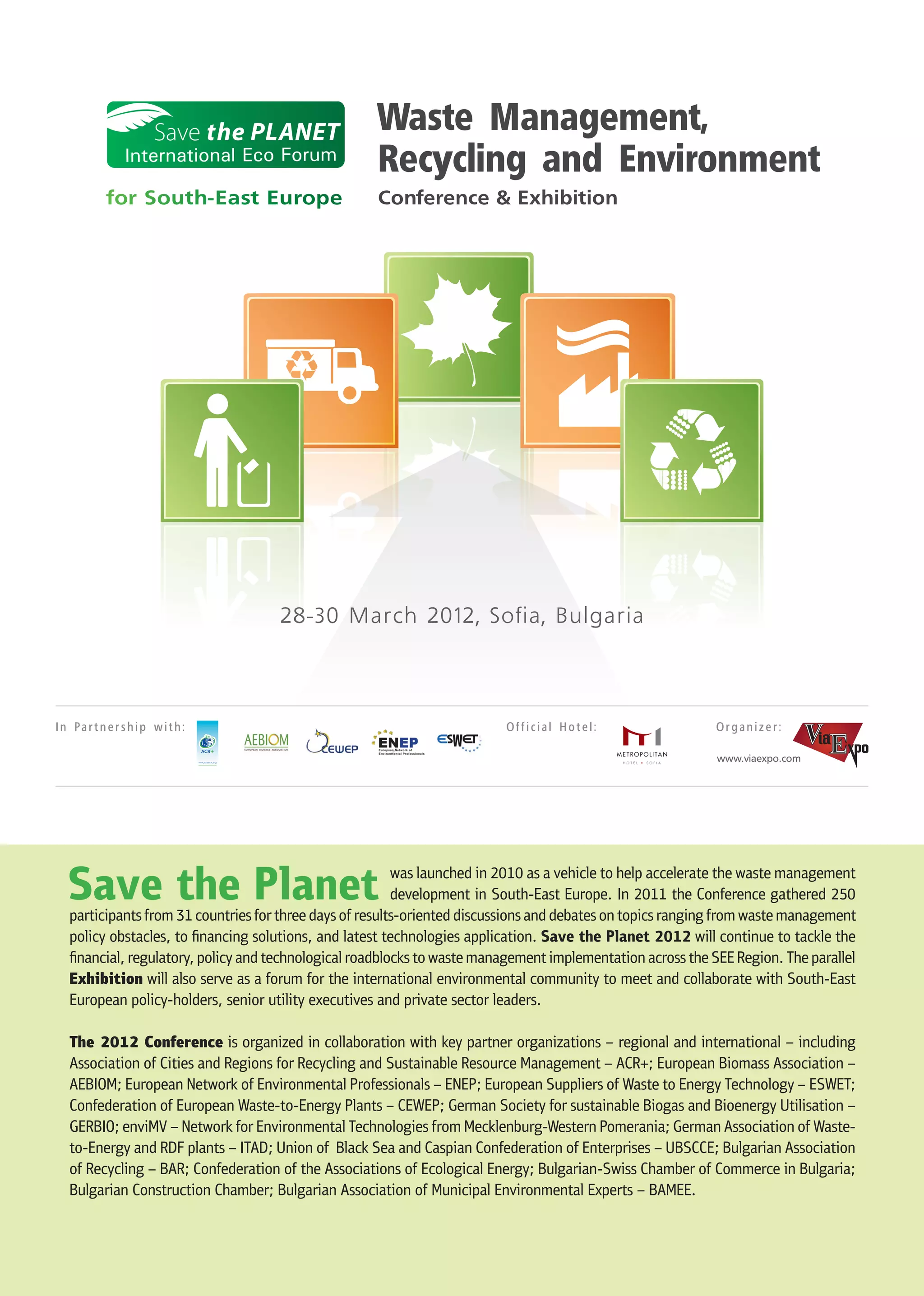 The document outlines the Save the Planet conference and exhibition focused on waste management in South-East Europe, scheduled for March 28-30, 2012, in Sofia, Bulgaria. It highlights the participation of various international organizations and key speakers who will discuss challenges and solutions related to waste management. The event will also feature an exhibition showcasing technologies for waste recycling, energy efficiency, and sustainable resource management, alongside opportunities for sponsorship and networking among industry professionals.