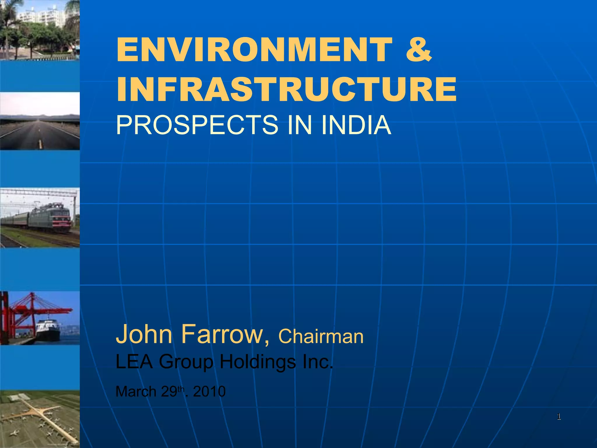 The document summarizes opportunities for infrastructure development in India, highlighting the Delhi Mumbai Industrial Corridor project as an example. It notes that India is the third largest economy in the world, urbanizing rapidly and investing heavily in infrastructure like highways, airports, ports and railways. The DMIC project will develop a manufacturing region along a 1500km corridor from Delhi to Mumbai, with world-class infrastructure including an industrial zones, airports and ports, representing a $90 billion investment opportunity. Canadian companies are well positioned to participate given shared business practices and government support.