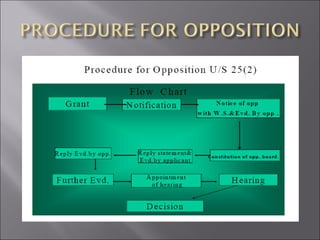 The document discusses various grounds for opposing patents in India, including pre-grant and post-grant opposition. It provides examples of prior art, lack of inventive step, insufficient disclosure, and failure to disclose foreign applications that can be used as grounds for opposition. Oppositions must include a notice of opposition, applicable fees, and evidence to support the specific grounds being raised.