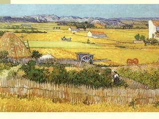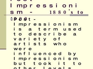 Post-Impressionism developed in the 1880s-1900s as an extension of Impressionism. While Impressionism depicted idyllic scenes using vivid colors and brushstrokes, Post-Impressionism was more emotionally charged and emphasized form. Key Post-Impressionist artists included Paul Cézanne, Vincent van Gogh, Paul Gauguin, and Georges Seurat. Each developed unique styles, with Cézanne bringing structure to Impressionism, van Gogh using color and brushstrokes to depict mood, Gauguin seeking primitive expression, and Seurat exploring color science.