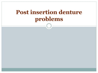 Most patients experience some problems adjusting to new dentures. Common complaints include sore spots from poor fit, burning sensations from pressure on nerves, and instability when not chewing. Bite issues can also cause difficulties with eating, talking, and jaw pain. Regular checkups are important to identify and address issues through relines or new dentures. Proper fit is key to comfort and function.