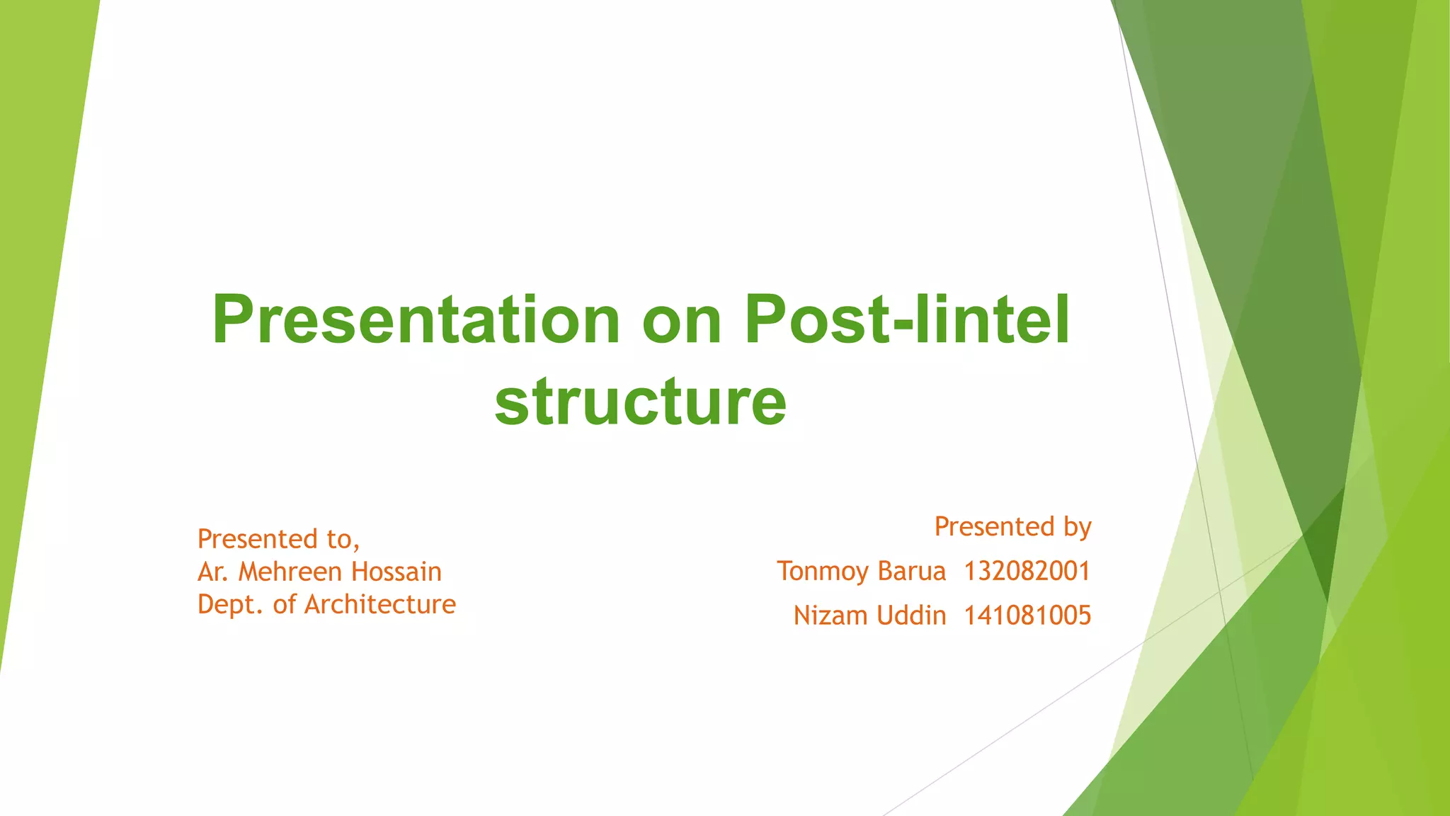 The presentation by Tonmoy Barua and Nizam Uddin explores post-lintel structures, outlining fundamental concepts such as load types, structural systems including framed and load-bearing structures, and various foundation types. They detail key components such as columns, beams, and their configurations, along with advantages and disadvantages of using post-lintel systems in construction. Case studies illustrate practical applications, showcasing their functionality and aesthetic benefits in architectural design.