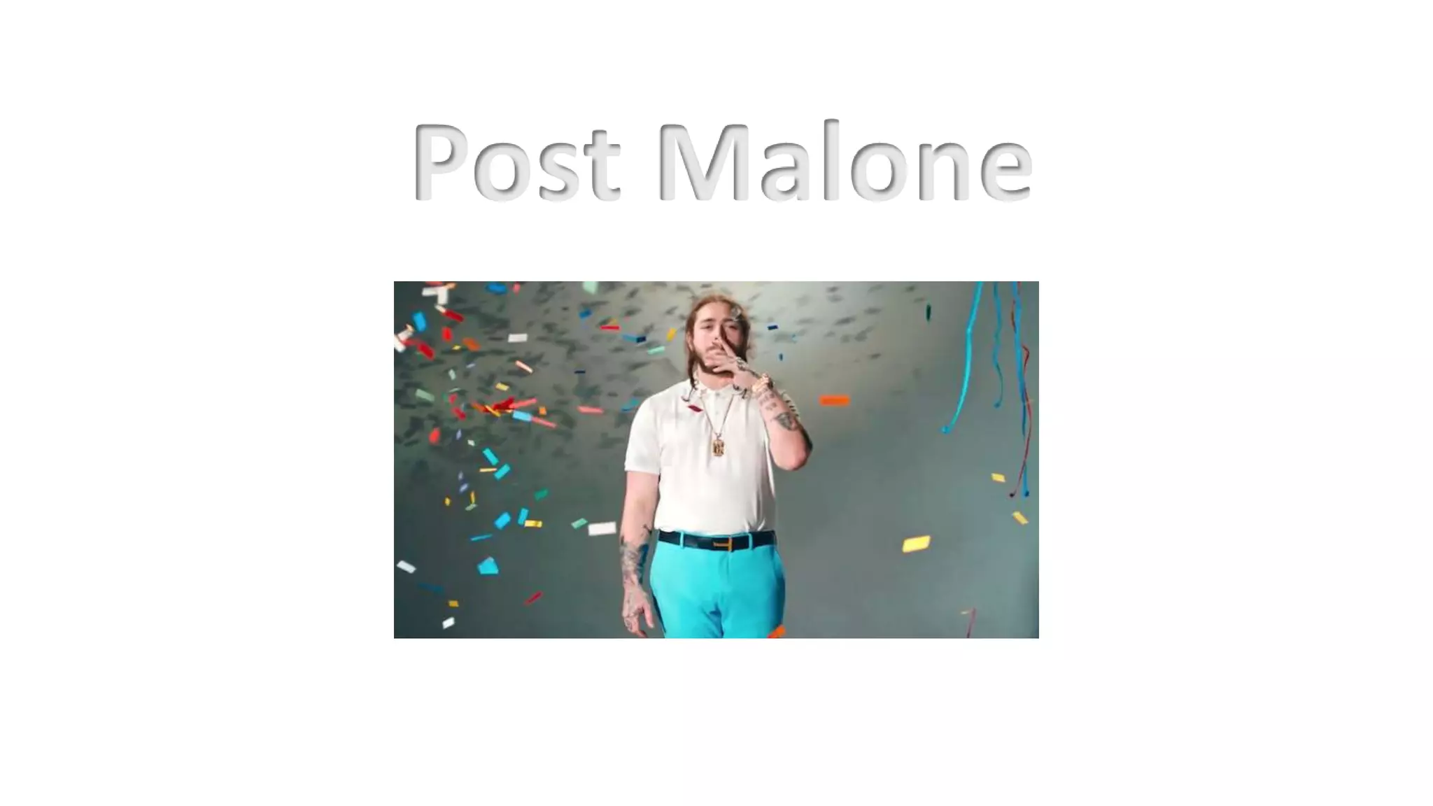 Post Malone, whose real name is Austin Richard Post, is a 22-year-old American rapper, singer, and songwriter born on July 4, 1995. He came up with his stage name Post Malone through an online name generator. While his music spans genres like hip hop, trap, and R&B, he enjoys listening to all genres and began making music similar to country. Post Malone has had a unique style and image since high school where he was known for his fashion. He is signed to Republic Records and gained recognition in 2015 with his debut single "White Iverson".