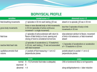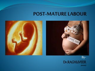 Post-term pregnancies are those that go beyond 42 weeks of gestation. The placenta starts to deteriorate after 42 weeks, limiting nutrients and oxygen to the fetus. This can cause complications like meconium aspiration and fetal distress. Monitoring options include fetal movement charts, CTG, ultrasound to check amniotic fluid levels and biophysical profiles. Labor induction is generally recommended over expectant management after 42 weeks to reduce risks.