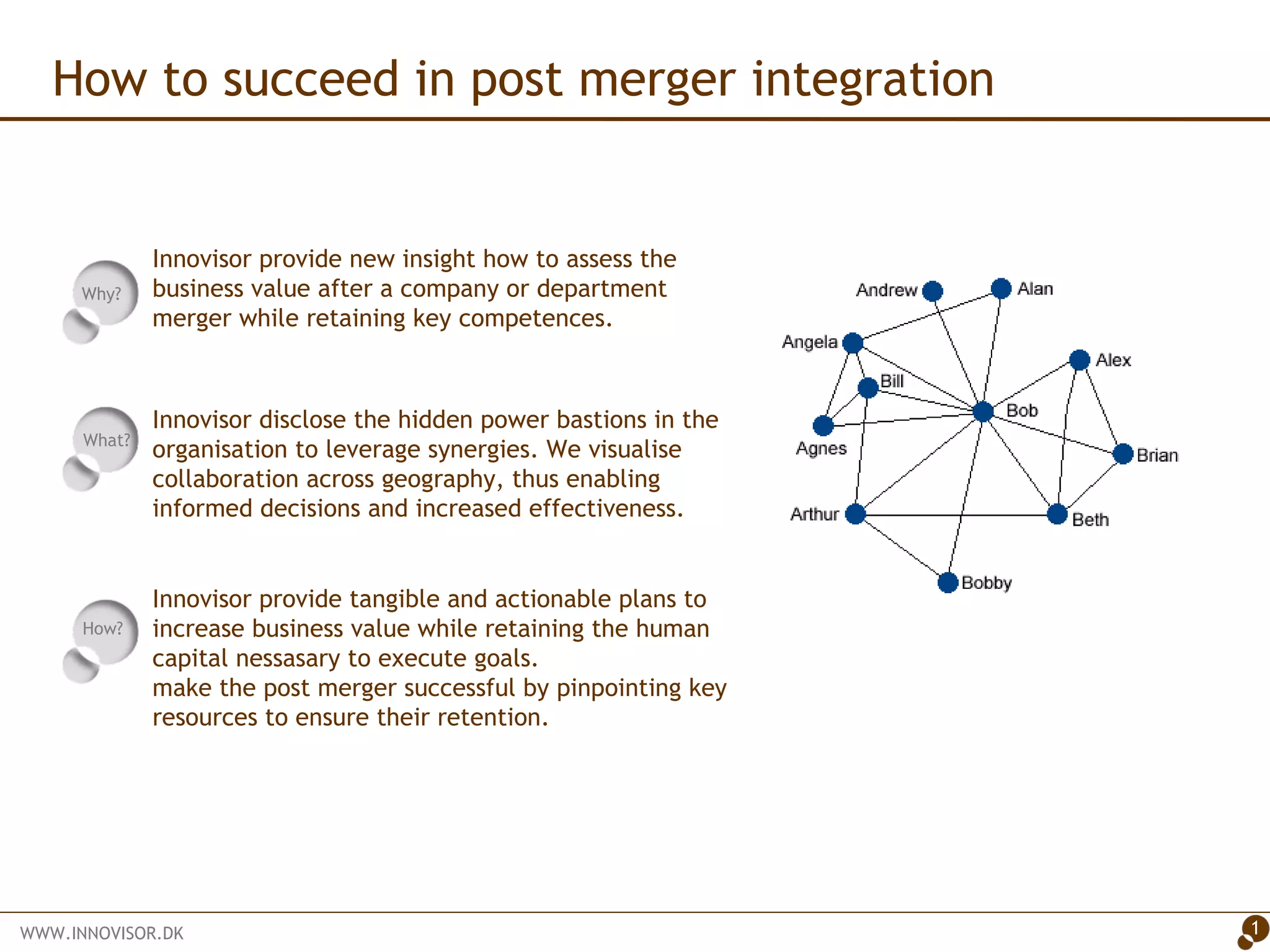 The document discusses how to succeed in post-merger integration by assessing business value while retaining key competencies. It recommends using Innovisor's approach to visualize collaboration, discover how work gets done, identify key staff, and gain insights from employees. This allows for fast translation of insights into decisions and actions through tangible plans within 6 weeks to increase business value while retaining human capital. A case study shows how Innovisor helped an American acquisition become successful by trimming the organization and implementing changes to focus the business.