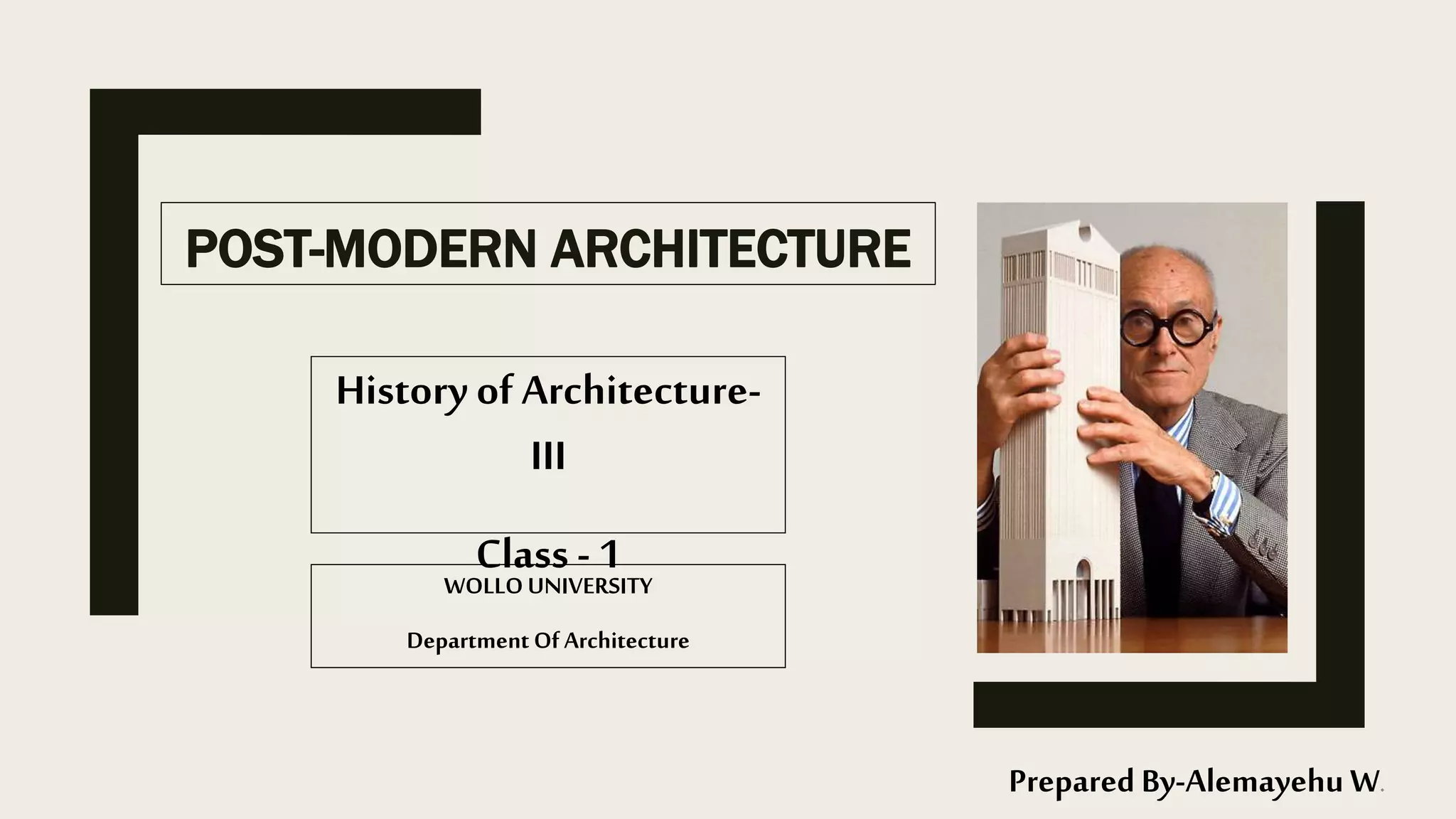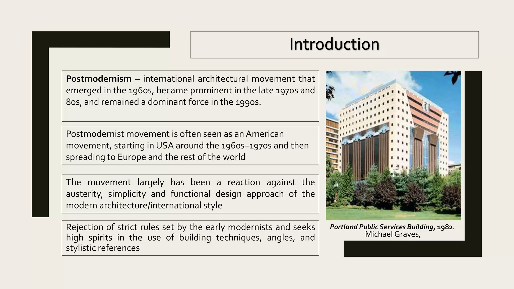 Postmodern architecture emerged in the 1960s as a rejection of the strict functionalism of modern architecture. It sought to reintroduce ornamentation, color, and references to historical styles. Key characteristics included drawing from multiple sources rather than pure forms, moving away from neutral colors, and taking elements from different styles and combining them in new ways. Notable postmodern architects included Robert Venturi, Philip Johnson, and Michael Graves.