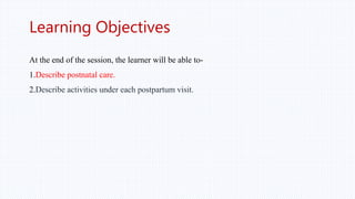 3. Subsequent visits continue monitoring for issues like bleeding, infection and mental health, while reinforcing counseling on diet, rest, contraception and breastfeeding. The postnatal period requires close support and care of both mother