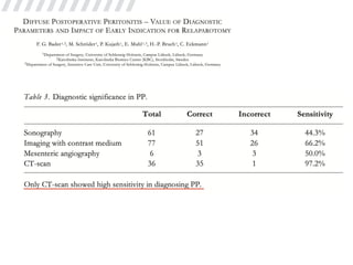 2. Diagnostic imaging and laboratory findings were consistent with secondary peritonitis developing after the initial surgery.