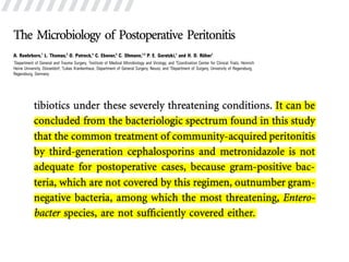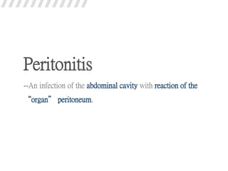 1. The patient developed postoperative peritonitis after undergoing surgery to repair a pre-pyloric perforation.