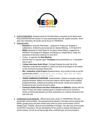 This mid-term report summarizes the progress of the school radio project. It discusses the decisions made at the recent Portugal meeting, including assigning tasks to different countries. Accomplishments so far include developing a logo, conducting surveys, and countries creating radio spots and shows. Upcoming deadlines and meetings are outlined according to the original proposal. The report provides an overview of each country's contributions and suggests improving communication and organization. It concludes by emphasizing the value of international cooperation and friendship among students despite challenges.
