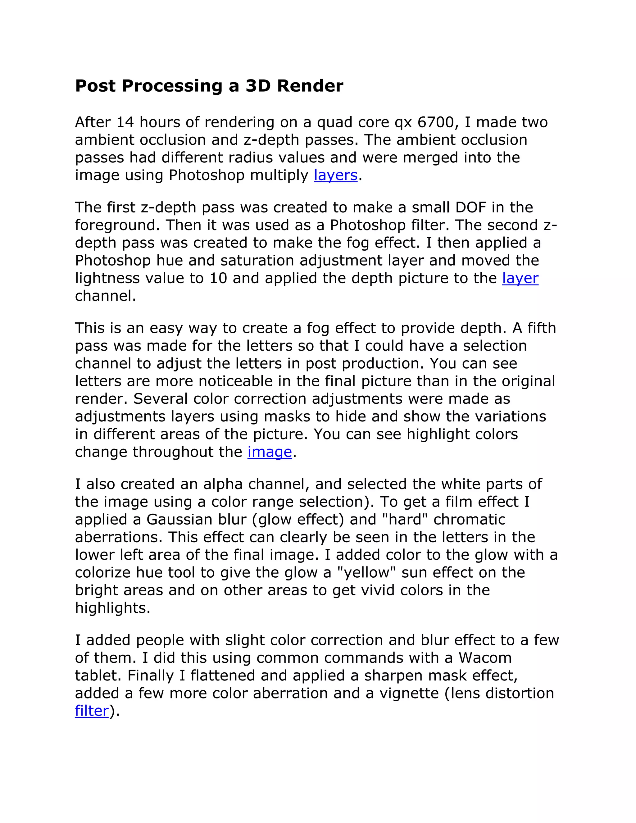 The artist rendered an image for 14 hours, then made additional passes for ambient occlusion, depth of field, fog, and selecting letters. They used Photoshop to merge layers and apply filters to create effects like fog and depth. Several color correction, blur, and distortion adjustments were made through adjustment layers and masks to refine highlights, shadows, and add a film-like quality to the final rendered image.