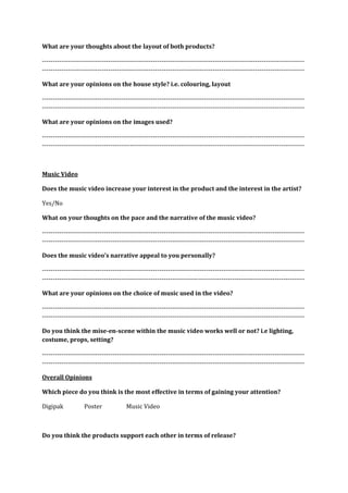 This document contains a post-production questionnaire to gather audience feedback on media products. The questionnaire asks for the respondent's gender, age, employment status and location. It then asks questions about the digipak, poster and music video individually and as a package. Questions address whether the items attract attention, increase interest, have cohesive style and work well together. The purpose is to understand the target audience's views in order to improve future media products.