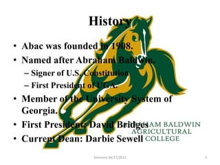 Abraham Baldwin Agricultural College (ABAC) was founded in 1908 in Tifton, Georgia and is named after Abraham Baldwin, a signer of the U.S. Constitution and first president of the University of Georgia. ABAC is a rural campus located about 170 miles from SMHS that offers two-year degrees in programs like rural studies, early childhood education, and business. The college has around 3,665 students, most of whom are full-time, and offers a small campus feel with smaller class sizes and opportunities to interact closely with professors.