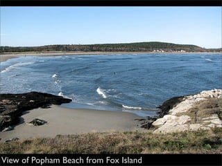 Popham Beach in Maine was viewed from Fox Island after a storm, with large surf visible. Also seen was Seguin Island Light, a lighthouse first constructed in 1795 on Seguin Island off the coast of Phippsburg, Maine that was rebuilt in 1857 and still stands today.