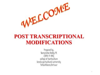 This document summarizes post-transcriptional modifications in eukaryotes. It discusses how eukaryotic mRNA undergoes processing, including capping, splicing to remove introns, and polyadenylation. Splicing requires snRNPs and the spliceosome to recognize splice sites. Alternative splicing allows one gene to code for multiple proteins. tRNA and rRNA also undergo processing as they mature, including modification of bases and removal of sequences. Final mature mRNA, tRNA, and rRNA are then ready for translation.
