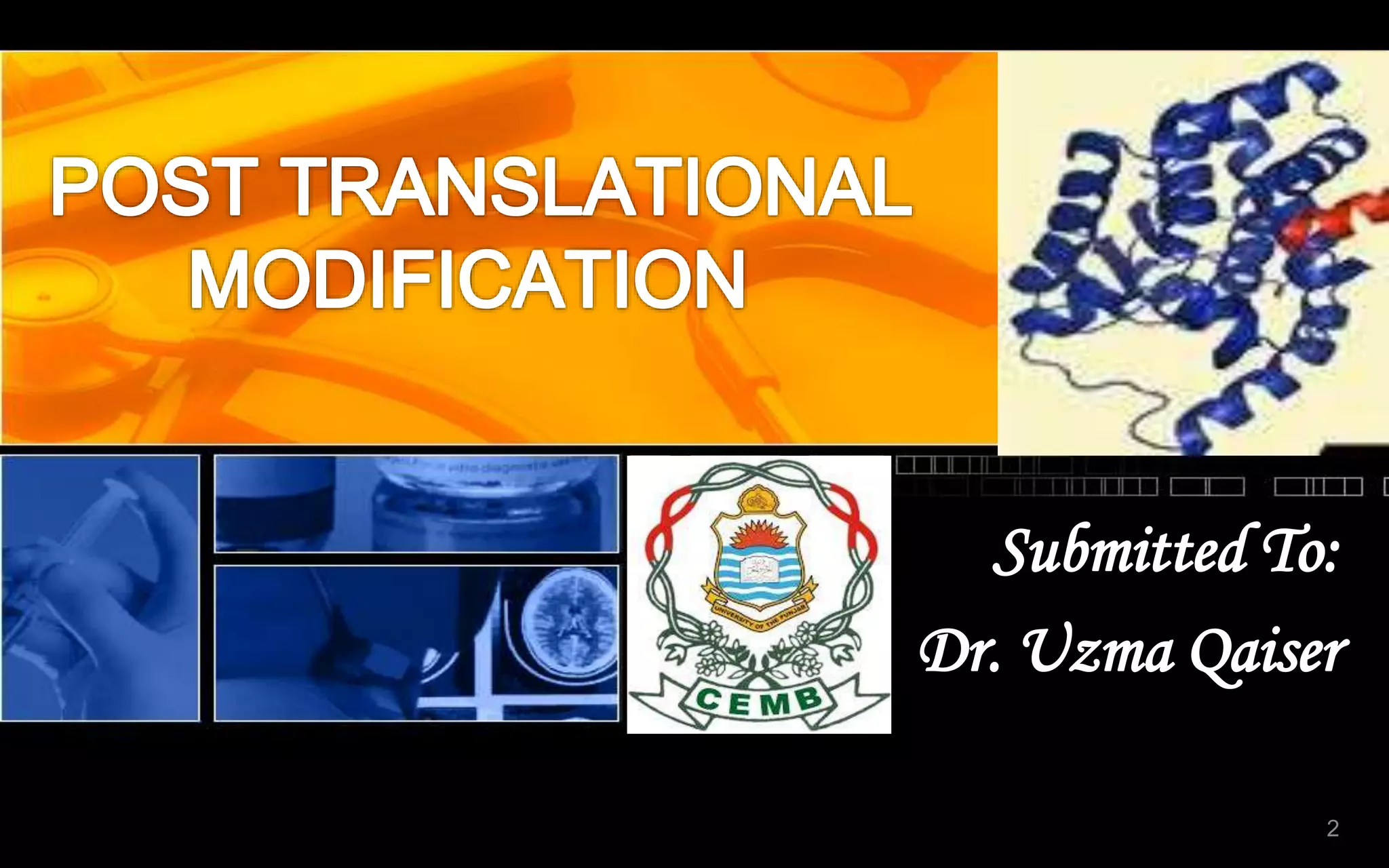 The document discusses post-translational modifications (PTMs), which are chemical modifications of proteins after translation, essential for their stability, activity, targeting, and signaling. It covers various types of PTMs, such as phosphorylation and glycosylation, their roles in protein diversity, and the mechanisms of protein splicing. Detection techniques for PTMs, including gel-based and mass spectrometry methods, are also outlined.