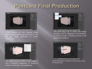 The document describes the process of designing a movie poster and website. For the poster, the creator used their original film prop image, flipped it horizontally, increased brightness, added a masthead, stars, and adjusted colors. For the website, they chose a black background with white text for contrast. The poster design was used prominently and resized appropriately. Additional pages and graphical elements like social media links were included to offer more content for consumers.