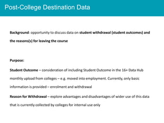 The document discusses the improvement of data sharing regarding post-college destination outcomes, focusing on understanding student withdrawal reasons and enhancing the 16+ data hub's monthly uploads from colleges. It highlights the need for accurate and comprehensive data to provide better services and support for young people while ensuring effective partnership collaborations. Additionally, it outlines necessary updates to data sharing agreements, reporting methods, and the standard file transfer processes to improve data management.