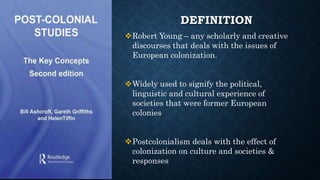 This document provides an overview of postcolonialism, including its definition, origins, key theorists, themes, and texts. It begins by defining postcolonialism as the study of the political, cultural, and linguistic experiences of formerly colonized societies. Some of the major theorists discussed include Edward Said, Frantz Fanon, Gayatri Spivak, and Homi Bhabha. The document also summarizes several postcolonial novels from different regions, including Africa, India/Pakistan, the Caribbean, and Australia/New Zealand to illustrate common postcolonial themes.