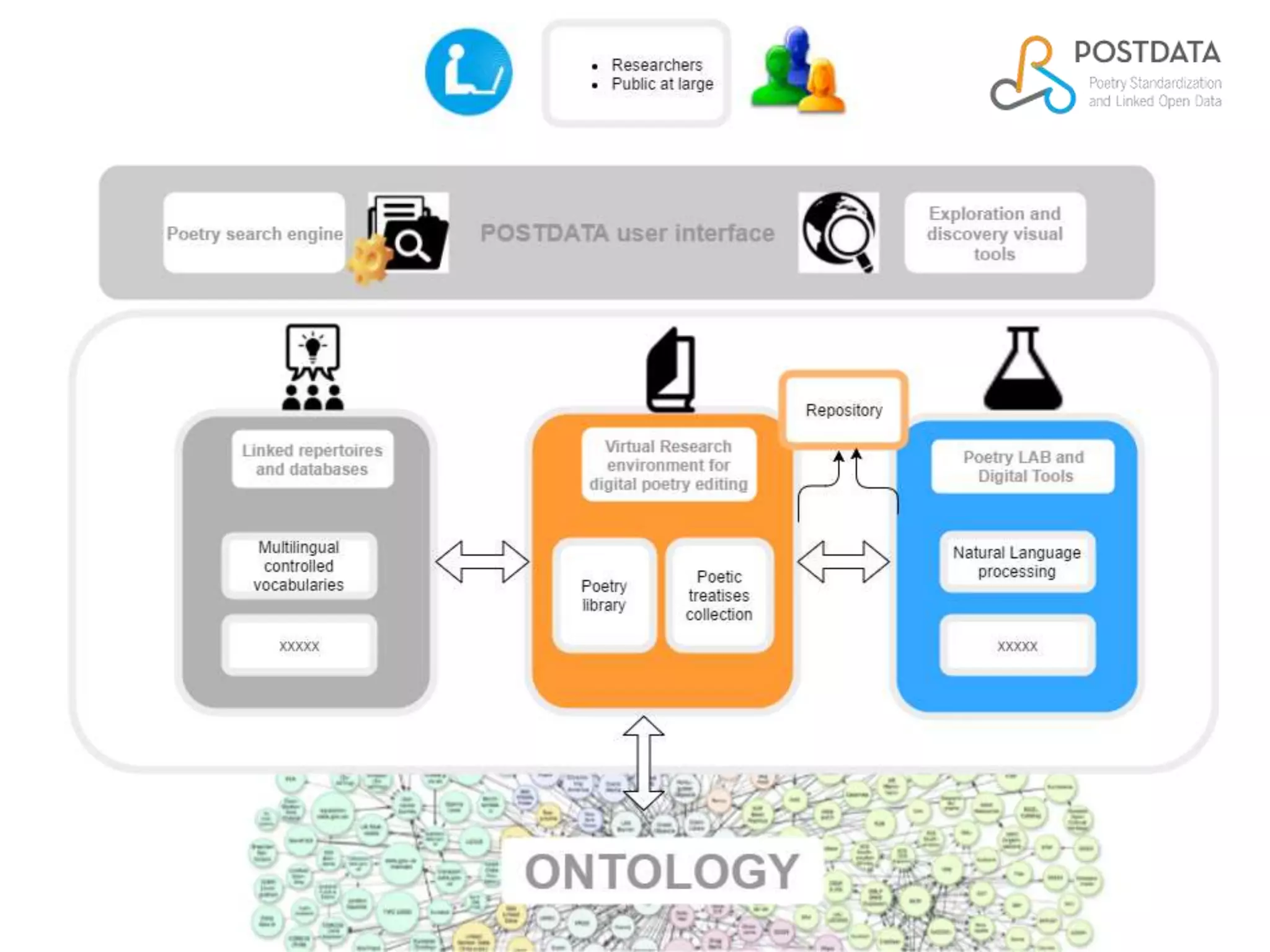The document summarizes the POSTDATA project, which aims to ease humanist research through the digital transformation of philology. The project addresses barriers caused by different conceptualizations of poetry across traditions and lack of standardization. It develops an ontology for poetry as linked open data to enable interoperability. The workplan involves analyzing concepts to develop a shared abstract model, designing a platform for storing and analyzing poetry, and implementing the model and platform over five years through interdisciplinary teamwork and training. The project expects to yield improved research collaboration and results through open-access resources and further applications.