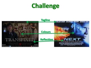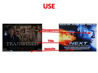 The film poster takes elements from the existing film poster for 'Next' including using transparency to portray the ghostly female character, positioning the title and website address similarly, and including a landscape background and principal cast names. It challenges conventions by using a darker color scheme appropriate for the horror genre rather than the thriller/action colors of 'Next' and by adding a reflection to the title text not found in the original poster. The poster aims to draw initial attention to the male character before revealing the stalking female ghost and convey the narrative and appeal of the film.