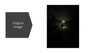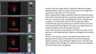This document summarizes the process of editing an image for a print advertisement. It describes how the author labeled layers to edit specific components. A red background was added to match the client's logo and slogan. The green coloring was made more vibrant and lighting was adjusted using soft light. Different placements for the logo and text were tested before deciding the bottom placement was best as it allowed consistency across advertisements while keeping the audience and client engaged. The final image balances the sky, green coloring, and lighting effects to create a mysterious atmosphere as intended.