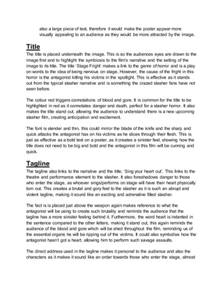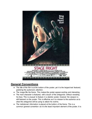 This poster for the slasher film "Stage Fright" effectively conveys key elements of the film's narrative and tone through its visual design and use of symbolic colors. The poster features the main character and antagonist's weapon but not his face, teasing viewers. Red dominates to symbolize blood and danger. Though few costume details are shown, the antagonist's black leather glove implies a mysterious and threatening killer. The theatrical stage setting and tagline "Sing your heart out" foreshadow brutal killings during a performance. Overall the poster provides just enough intrigue to draw in viewers while leaving some mystery unresolved.