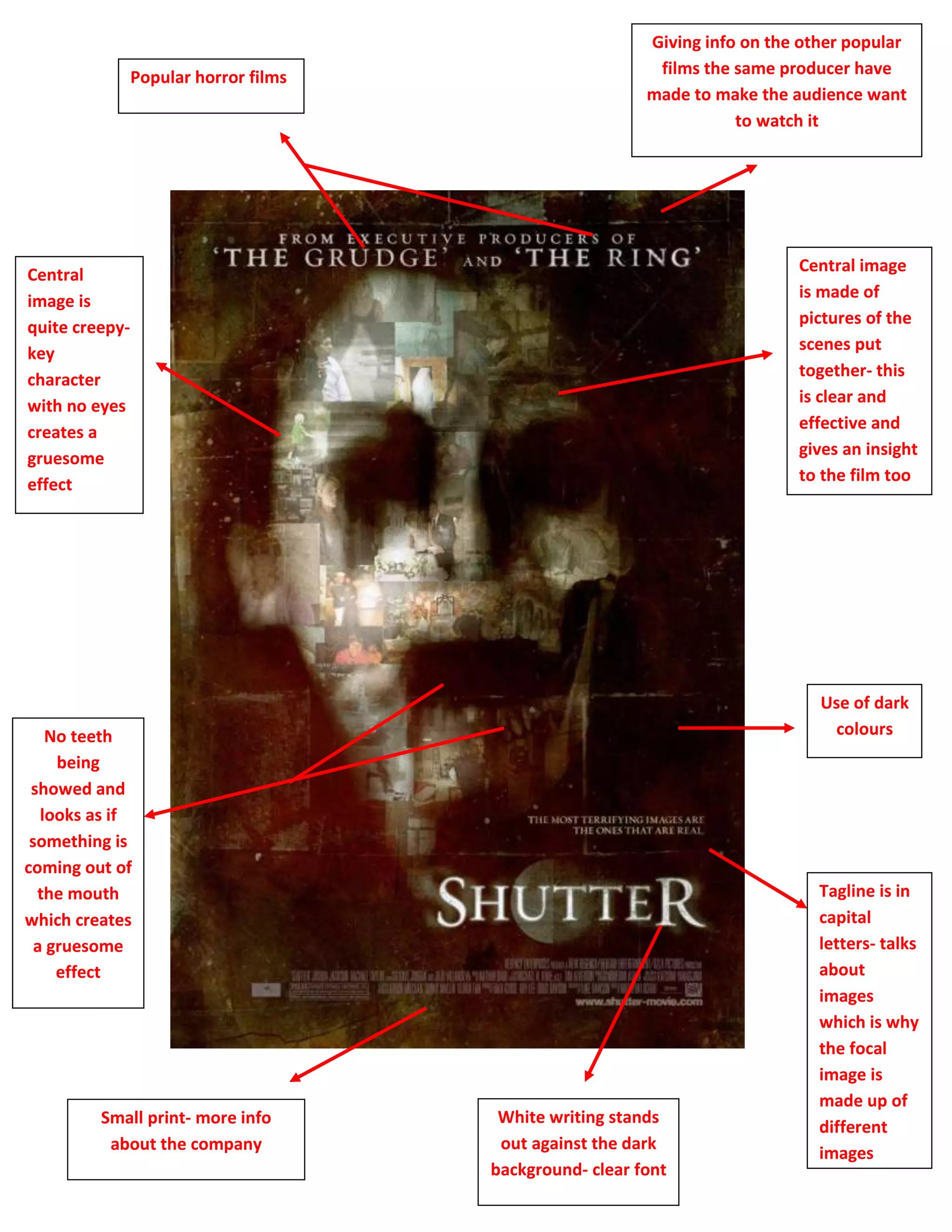 The document discusses the marketing poster for an upcoming horror film. It analyzes various design elements of the poster including the central image which is creepy and eyeless to create a gruesome effect. This central image is made up of scenes from the film to give insight into the movie. Dark colors are used and the tagline stands out in capital letters about images, relating to the collage-style central focal point.
