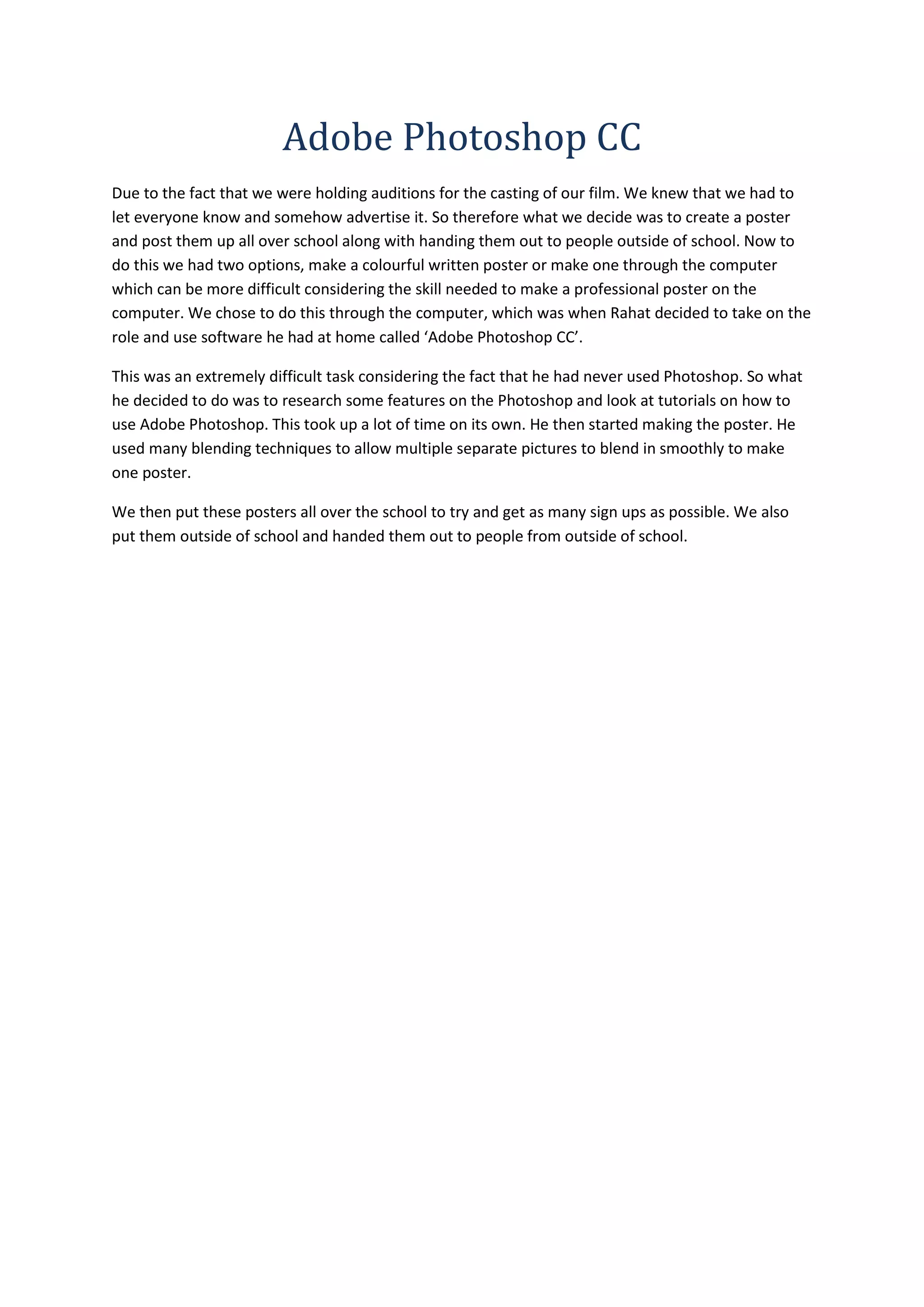 Rahat used Adobe Photoshop CC to create a digital poster advertising auditions for a school film, as it would allow for a more professional design than a handmade poster. As Rahat had never used Photoshop before, he spent time researching features and tutorials so he could learn how to use the software. He created the poster by blending multiple pictures together smoothly to form one cohesive design. The group then distributed the Photoshop poster around school and in the surrounding community to promote the audition sign-ups.