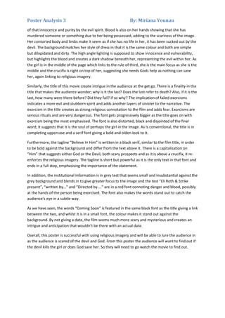 This poster promotes the horror film "The Last Exorcism" about a little girl who is possessed by an evil spirit. The poster image shows the girl bent backwards in an unnatural position, covered in blood with her hair tangled and limbs contorted to appear lifeless. Religious symbols like a crucifix placed over the girl and the tagline "Believe in Him" imply either God or the devil could help or harm her. The poster effectively uses frightening imagery and religious themes to intrigue audiences and promote the horror film's narrative of possession and exorcism.