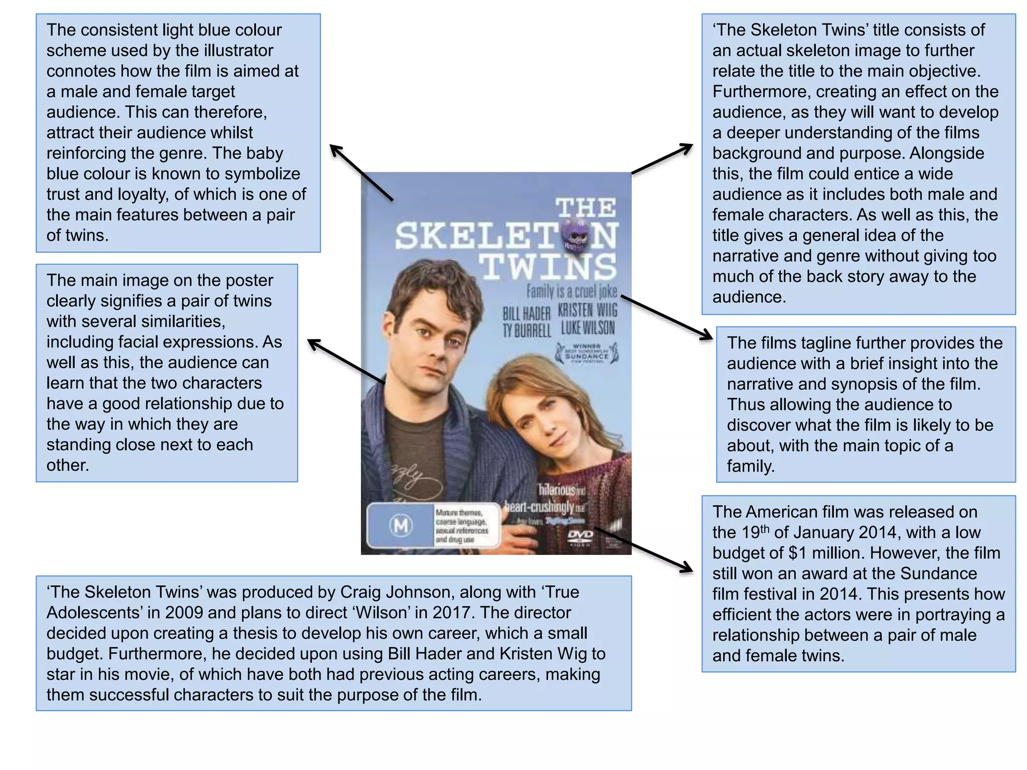 - The poster for "The Skeleton Twins" uses imagery of skeletons and a light blue color scheme to relate to the film's title and genre while attracting both male and female audiences.