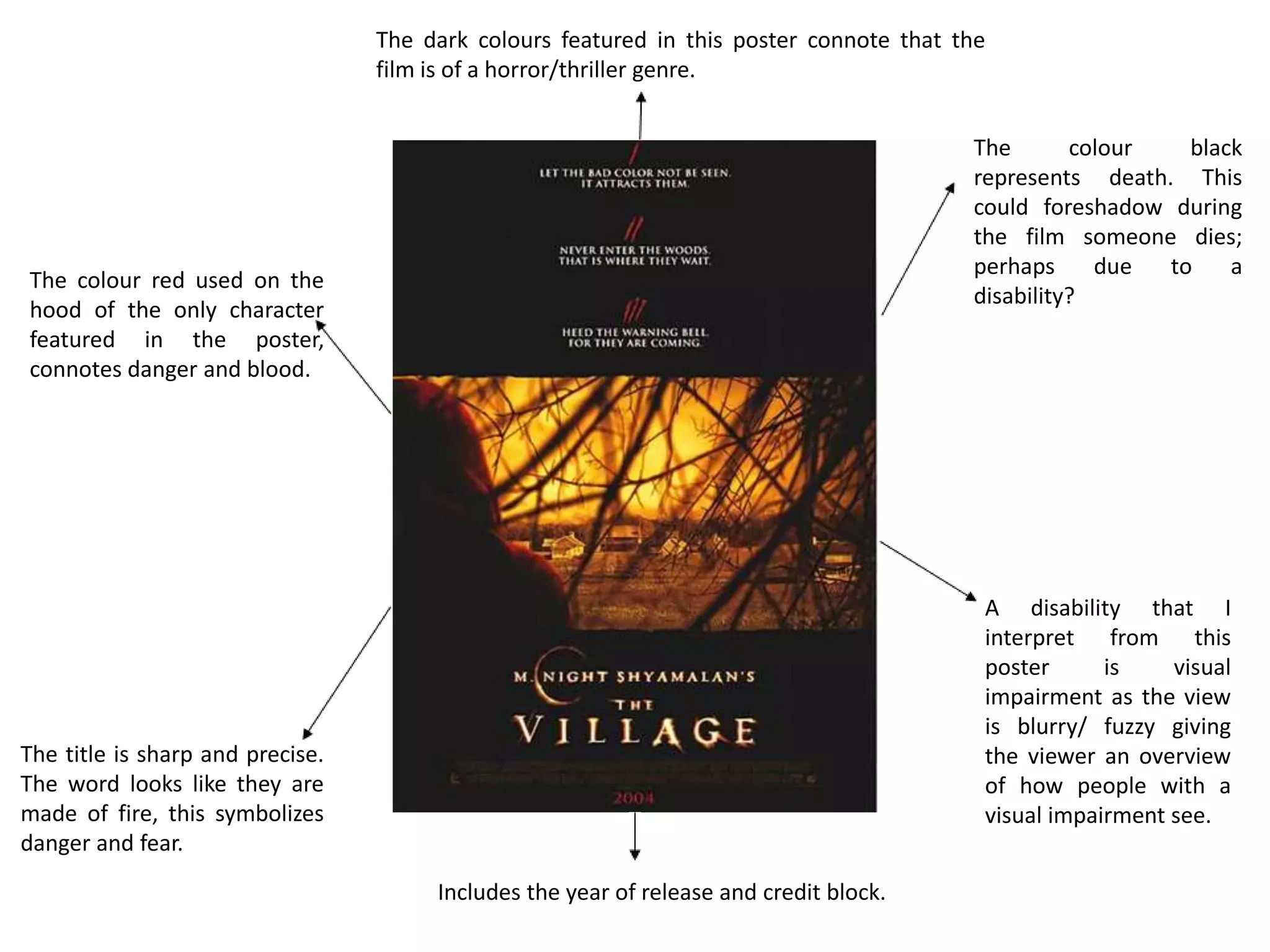 The document analyzes the symbolism and meanings conveyed by the visual elements in a movie poster, including colors, characters, and compositional elements. It suggests that reds symbolize danger, blacks represent death, blues create calm, bright colors indicate love, gold implies prestige, and dark colors on the perimeter foreshadow death. Glasses and a mask on characters are interpreted as conveying physical impairments. The romantic relationship between male and female characters holding hands implies the genre is romance.