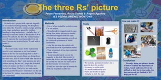 The students created an art project using 200 ring pulls and 50 bottle caps to promote recycling. They cut and painted an old cloth to create a 30x60 cm canvas. They then drew the recycling symbol with pencil and marker. Next, they sewed the ring pulls onto the cloth in a relief pattern and stuck the bottle caps around the symbol and cloth. Their goal was to raise awareness of reducing, reusing, and recycling among other students and remind them of the three R's. They enjoyed making their picture and learned about the importance of reducing waste.