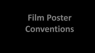 Film posters use conventions to effectively promote and advertise films. Common conventions include displaying the film title largest on the poster, including the main character and hints of the narrative in the main image, adding taglines to intrigue audiences, and placing institutional details and the release date smaller at the bottom. Following these conventions helps draw attention and excite target audiences.