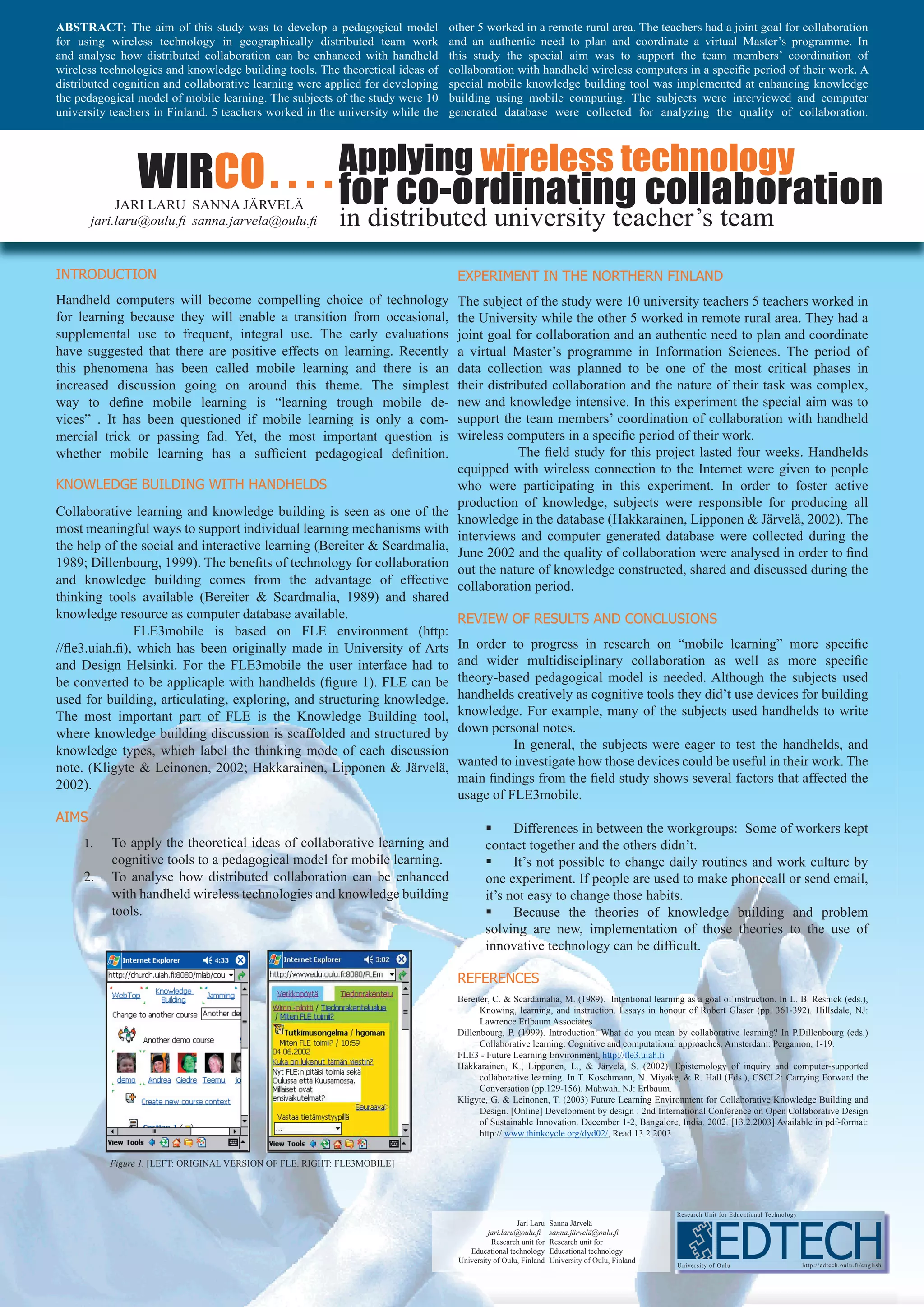 This study aimed to develop a pedagogical model for mobile learning by utilizing handheld wireless technology for distributed collaboration among university teachers in Finland, some of whom worked in remote areas. The research highlighted the challenges and factors influencing collaboration using these technologies, including differences in workgroup dynamics and resistance to changing established communication habits. Results from the four-week field study indicated positive effects on learning but emphasized the need for a more defined pedagogical framework for mobile learning.