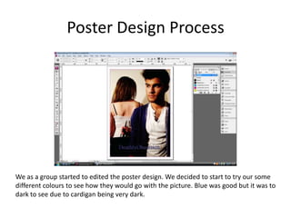 The document summarizes the poster design process for a film. It describes how the group tried different colors before selecting red to suit the thriller theme. They experimented with placement of the title and tag line. Effects were added like a red gradient fill to give an impression of blood. The stars' names were added in black or white fonts to stand out. Minor amendments were made before finalizing on the design.