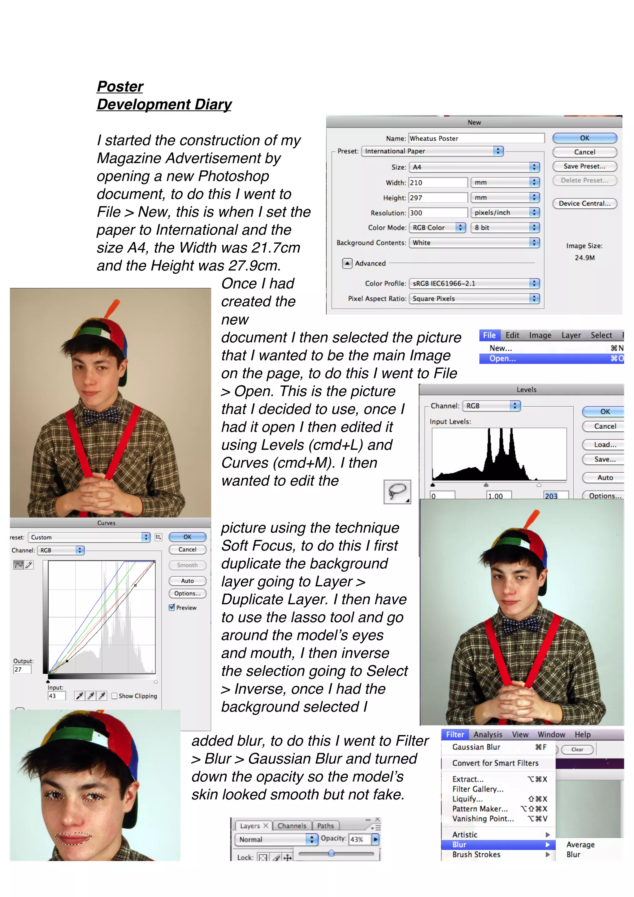 The document describes the process of creating a magazine advertisement poster in Photoshop. It details opening a new document, importing an image, editing the image using adjustment layers and filters, adding text and shapes, and arranging the elements on the page. The finished poster features a model with text promoting an album release below, surrounded by a border and stars representing ratings.