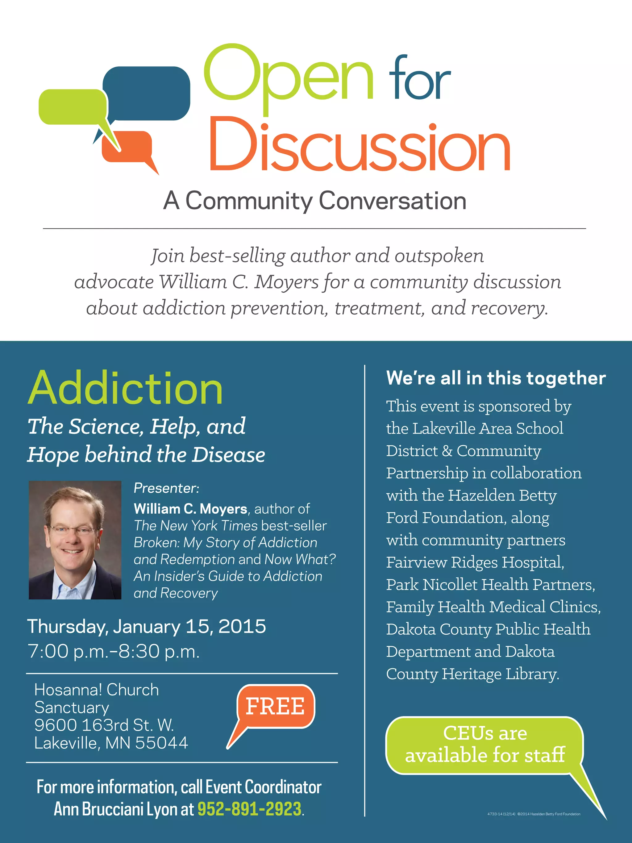 William C. Moyers will host a community discussion about addiction prevention, treatment, and recovery on January 15, 2015 from 7-8:30 PM at Hosanna! Church in Lakeville, MN. The event is sponsored by several community organizations and will provide information on the science, help, and hope behind addiction. Those attending can get more details by calling Ann Brucciani Lyon at 952-891-2923.