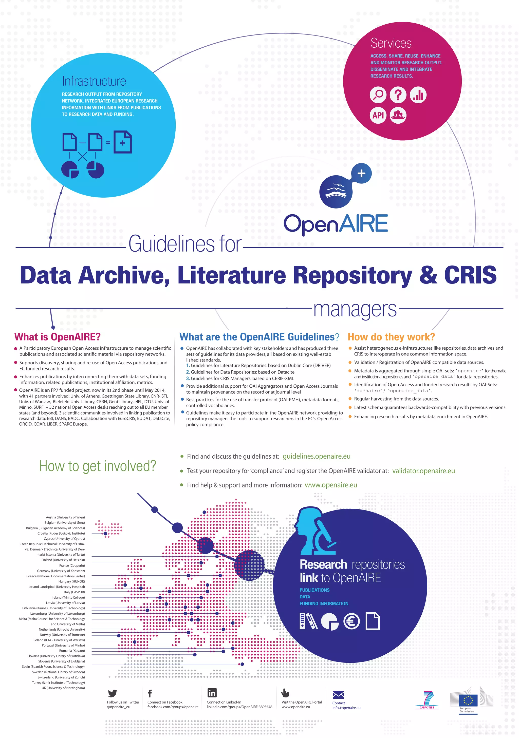 OpenAIRE is a European initiative aimed at managing scientific publications and associated materials through a participatory repository network, facilitating the discovery, sharing, and reuse of open access publications. It integrates research outputs with funding information and metadata, providing guidelines for literature and data repositories to ensure compliance with open access policies. The project involves multiple partners and supports interoperability among various e-infrastructures, with resources available for repository managers.