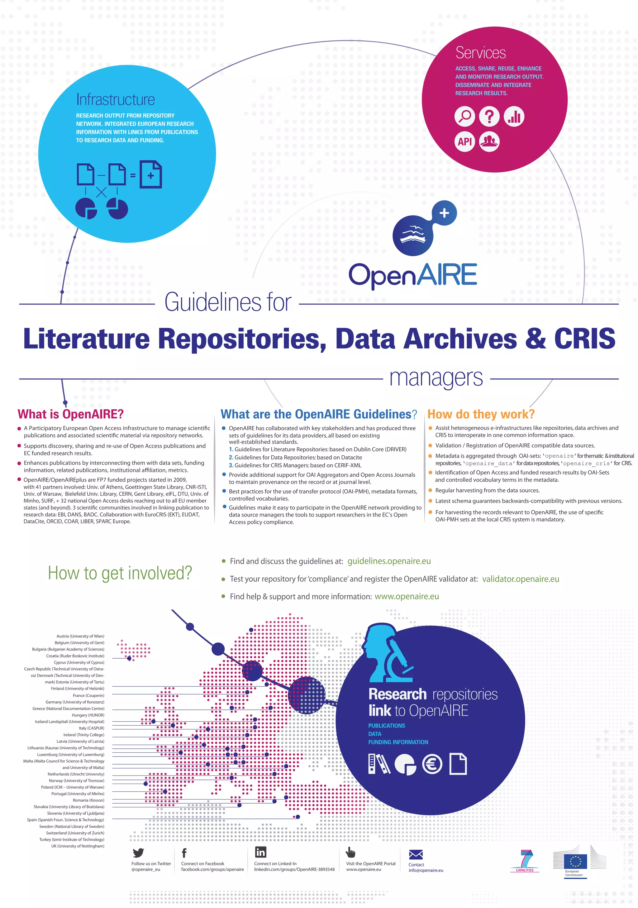OpenAIRE is a European initiative aimed at enhancing the discoverability and interoperability of research outputs across various institutions and repositories. It provides guidelines for literature and data repositories, and promotes compliance with open access policies, supporting the sharing and reuse of research findings. The program involves collaboration with numerous stakeholders, ensuring that metadata and research data are effectively aggregated and linked to publications and funding information.