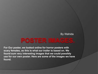The document discusses potential horror movie posters that could be used for a school project. It analyzes several existing horror posters featuring scary females and notes themes and visual elements that make them effective. These include close-up shots showing blood or injury, ambiguous facial expressions, and creative use of editing. The document concludes that an effective poster for the school project could show a close-up of the main character's face with white contacts or blood, combining vulnerability and a suggestion of turning villain.