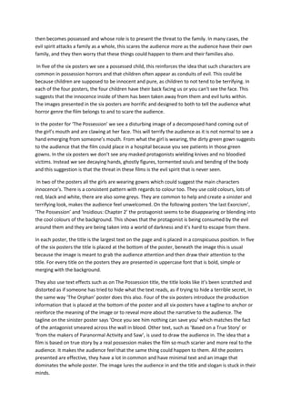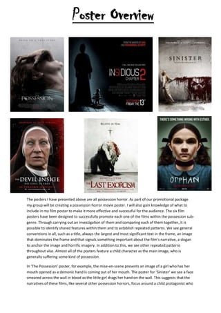 The document analyzes six movie posters for possession horror films. It finds that all the posters share common elements like a dominant image, title, and slogan. Nearly all feature an innocent child protagonist who becomes possessed, terrifying audiences by threatening families. The child characters often have their faces hidden or are turning into the background, suggesting their innocence is being consumed by evil. Imagery of decaying hands, ghostly figures, and distorted bodies aim to terrify without using masked killers or blood. Color palettes of red, black, and white create a sinister feel. Overall, the posters effectively promote their films as possession horrors through frightening visuals and consistency in design conventions.